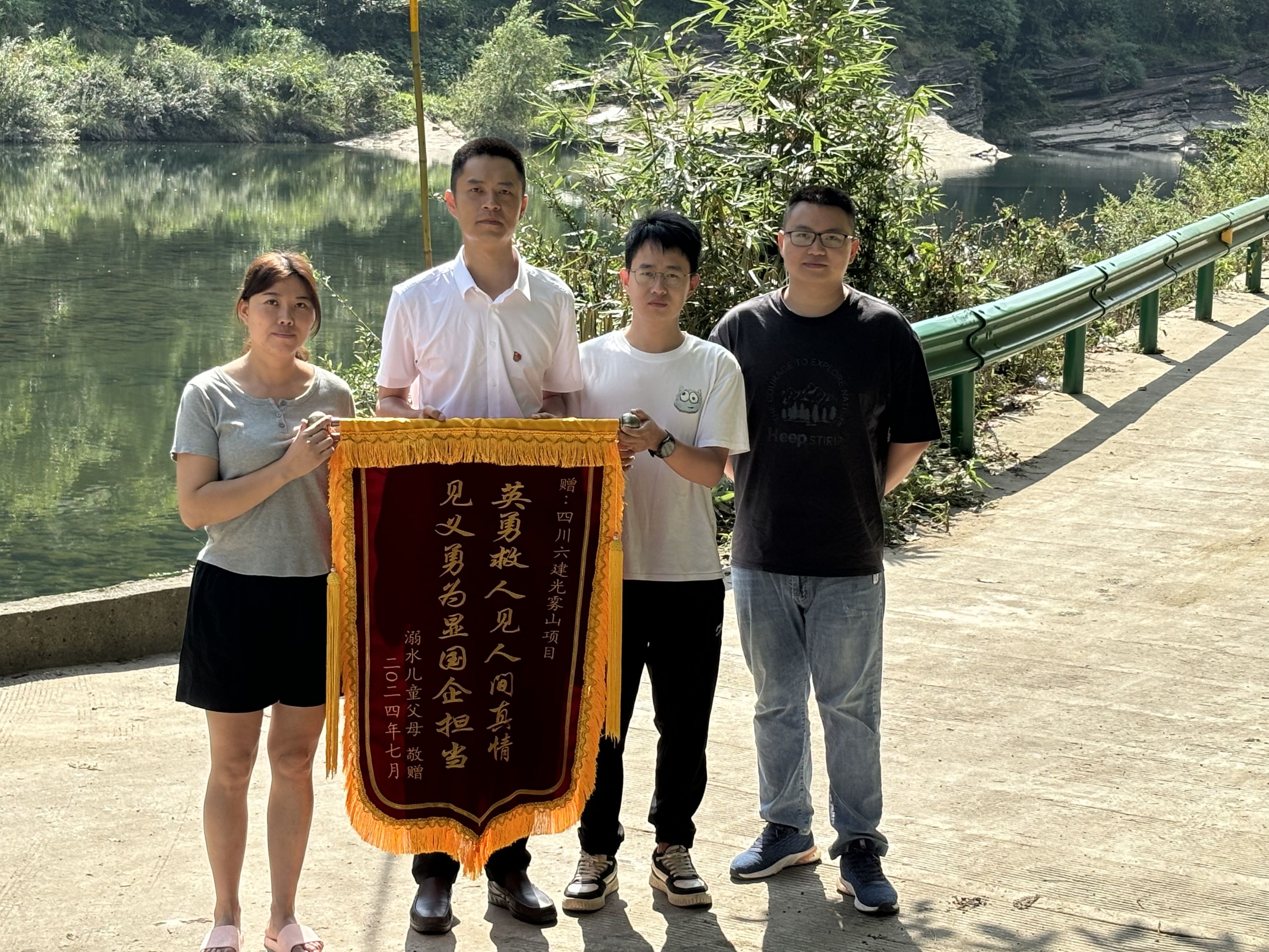 7月28日,位于光雾山旅游景区基础设施建设项目部附近的光雾山镇白头滩村一处漫水桥面一名儿童不慎落水,值此路过的项目管理员王小茜、罗文、唐昆三人见状挺身而出,合力救起了溺水儿童。几天后,孩子家长为项目部送来了“英勇救人见人间真情 见义勇为显国企担当”锦旗。