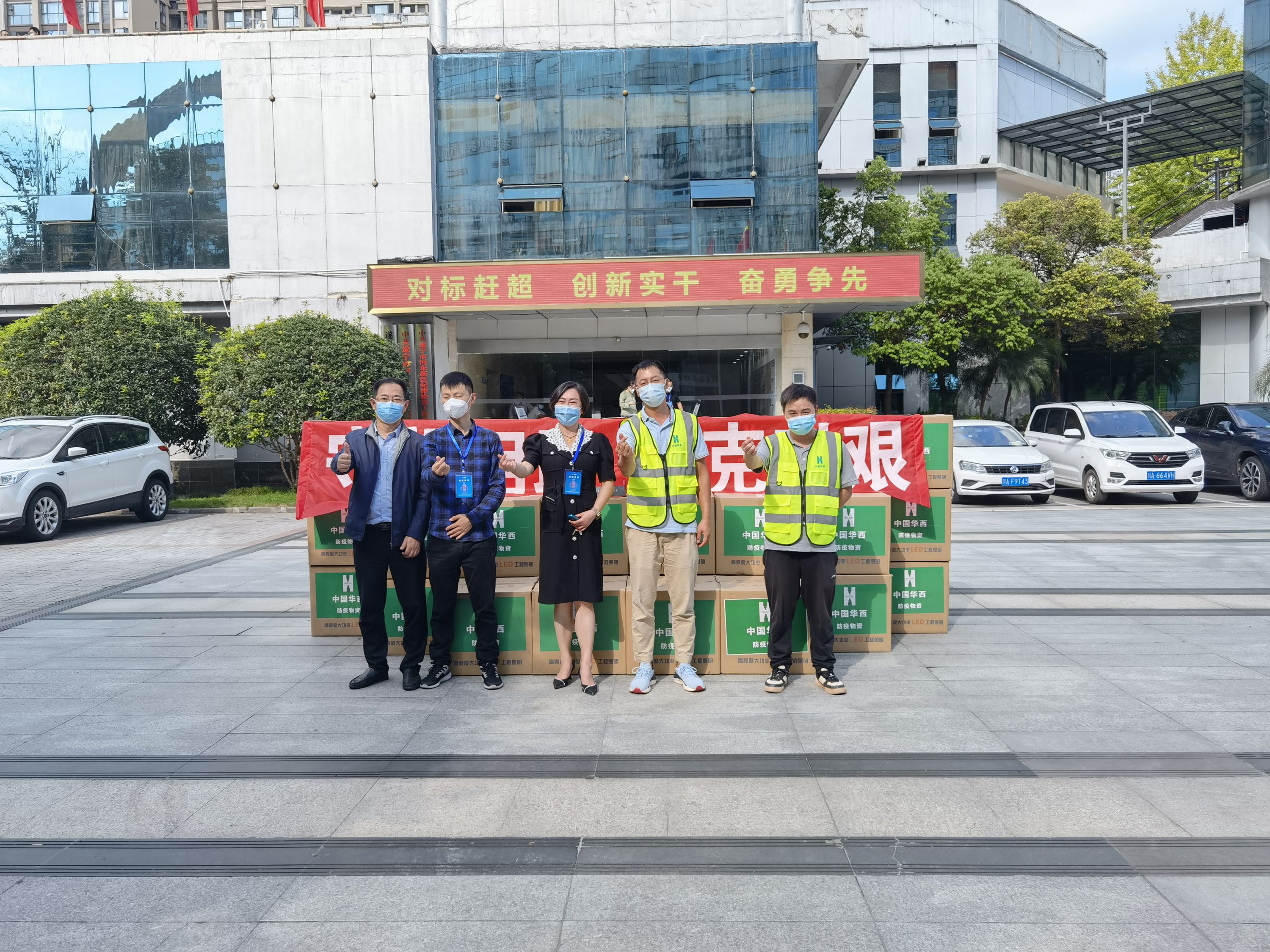 疫情来势汹汹,各类防护用品紧缺,项目部想尽办法调度应急资源,将口罩、免洗洗手液、消毒湿巾、消毒液等1000套防疫物资送到了遂宁市河东管委会手中。