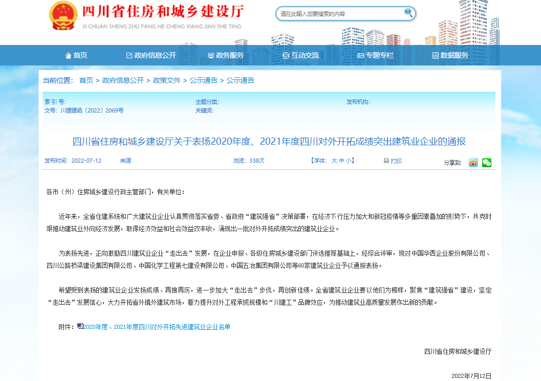 经过为期5个工作日的公示,近日,四川省住房和城乡建设厅正式对2020年度、2021年度四川对外开拓成绩突出的60家建筑业企业进行了通报表扬,公司位列其中!
