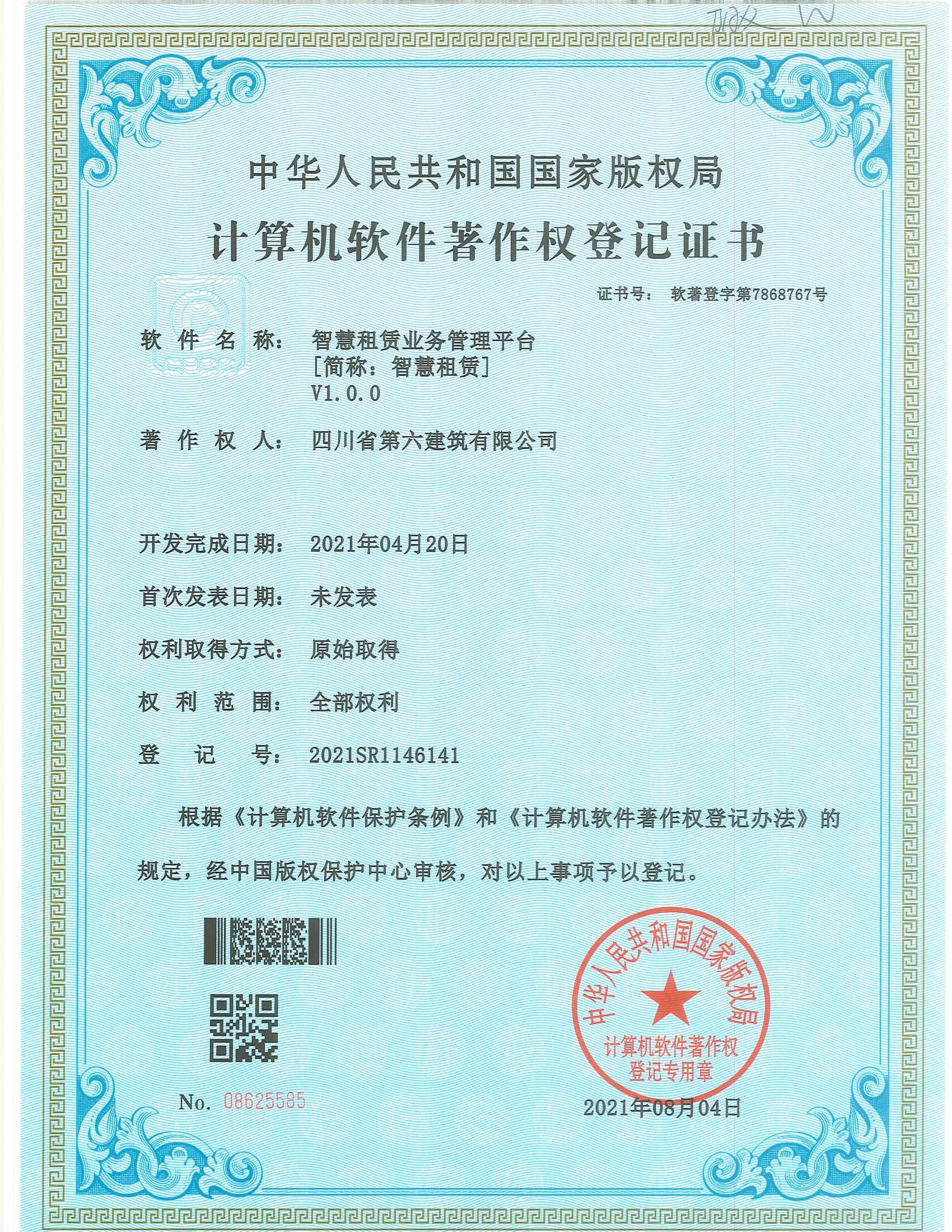 近日,由租赁分公司自主研发的智慧租赁业务管理平台(1.0版)获得国家版权局计算机软件著作权登记证书。
