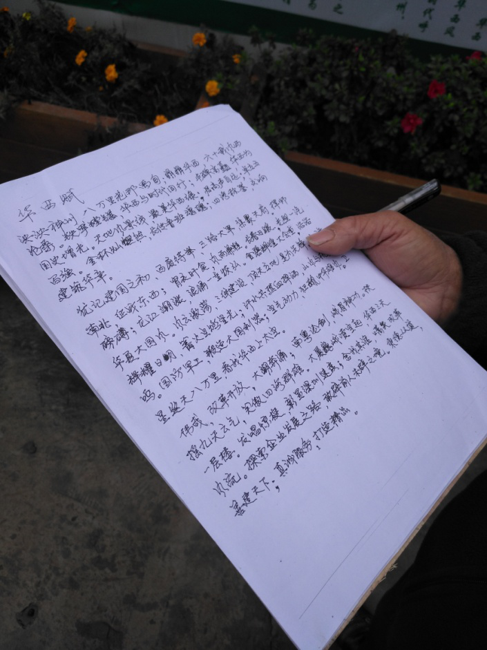 “欸乃一声山水绿”,这个字念“aǐ,三声”,这句话的意思是青山绿水间传来阵阵的摇橹声。我一边在脑海里急速搜寻着《华西赋》注释所留存的点滴记忆,一边班门弄斧的回答着师傅的提问,而这位师傅,一边思虑着不解之处,一边誊抄着这篇1010字的《华西赋》。