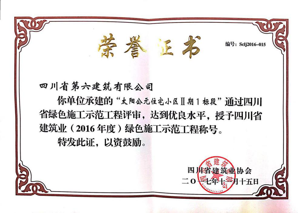 近日,由二分公司承建的太阳公元二期一标段项目荣获2016年度“四川省建筑业绿色施工示范工程”称号,并由四川省建筑业协会向公司代表颁发荣誉证书。