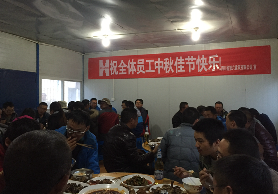 这天是中秋节,这些善建者们为了不耽误工期,仍然兢兢业业的坚守岗位。下午一下班,当他们回到食堂,惊喜地发现了一桌桌丰盛的晚餐。穿着厚厚的冲锋衣、羽绒服的华西人围坐在桌前,共聚一堂,在海拔3800米的高原上共同庆祝中秋佳节的来临。
