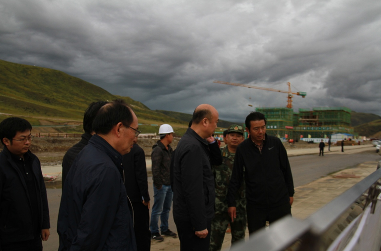 在展板前,冒着霏霏细雨,刘国中一行首先听取了来自业主方及各施工单位简明的工作汇报,站在“色达洛若撤乡建镇工程”规划图前,刘国中书记仔细询问每一项工程的施工进度情况,对公司承建的“色达县洛若镇公安分局及卫生院建设工程项目”表示非常满意,“施工单位一定要‘保质量、保安全、保工期’的完成承建任务,在这里看到公安分局跟卫生院的形象进度,要继续保持,打一个漂亮仗!”刘国中书记如是说道。
