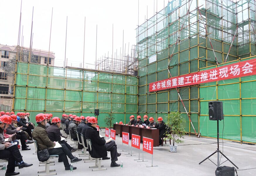 3月4日,省住房城乡建设厅副厅长王卫南、雅安市委常委徐一新、雅安市副市长卯辉以及来至雅安市各区县的领导在新芦山中学安居房项目召开全市城房重建工作推进现场会。
