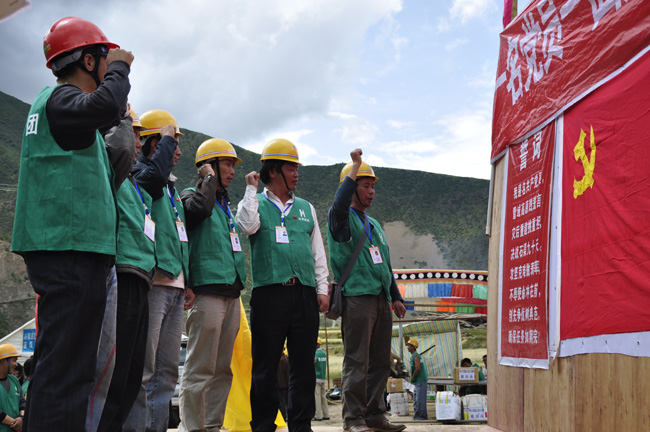 宣誓仪式上集团党委常委杨再德为全体党员一一佩戴好党徽,十三公司党委副书刘桂君为党员佩戴党员示范岗牌。7名党员面向鲜艳的党旗,高举右手,庄严宣誓:“我是名共产党员,雪域高原践誓言,灾后重建挑重担,决战石渠九十天,攻坚克难做表率,不辱使命冲在前,创先争优树典范,确保任务如期完!”响亮的誓言久久回荡在雪域高原。